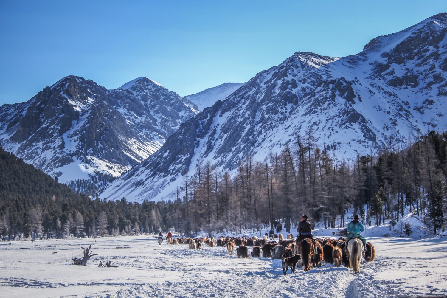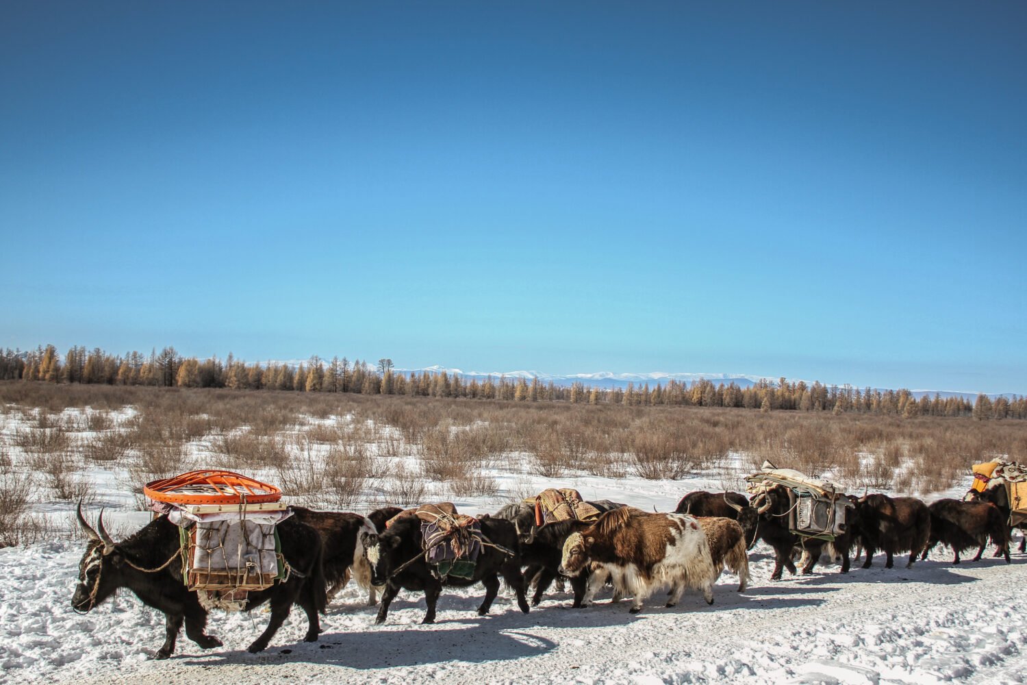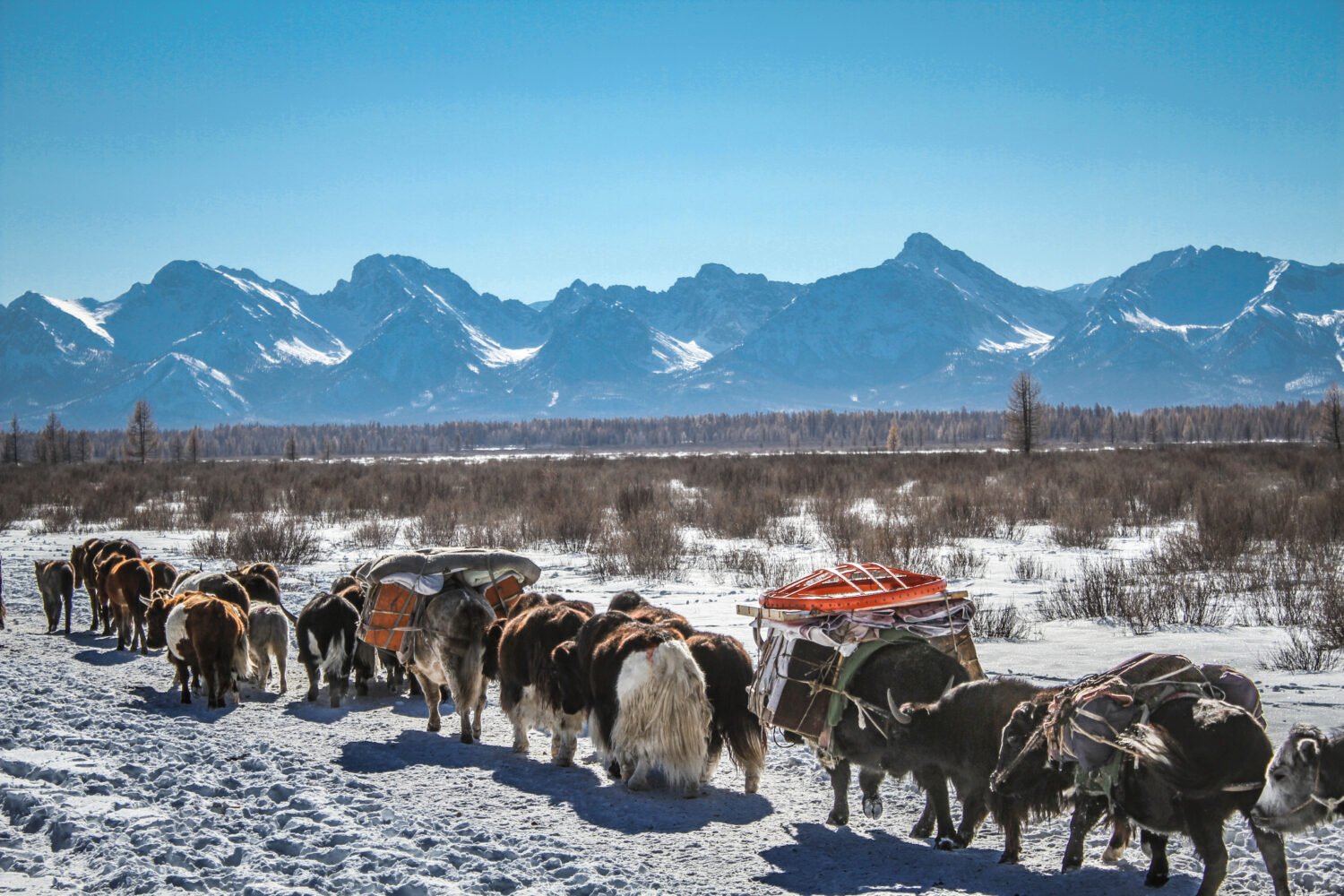 In this tour, you will witness the unique traditions of the Darkhad nomads, who still practice seasonal migration with yaks and hybrid cattle (hainag). Actively participate in packing gers, loading livestock, and herding animals across the pristine Darhad Valley and the Khordil Sardag Mountain Range. Share daily life with nomadic families, cooking, setting up gers, tending to livestock, and helping animals across rivers and mountain passes. Experience the balance between humans, animals, and nature in one of Mongolia’s most remote and breathtaking regions. And enjoy the spectacular scenery of snowy passes, frozen rivers, and the legendary Lake Khuvsgul, Mongolia’s “Blue Pearl.”